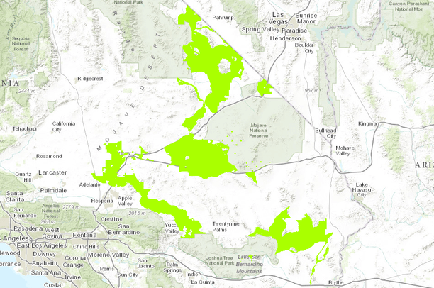 The authors used a least cost corridor analysis to identify linkages between tortoise conservation areas. In this output, the least cost corridor analysis did not include OHV or Dept of Defense lands as potential desert tortoise linkage habitats due to the multiple uses and potential threats to desert tortoises in these areas.